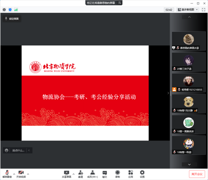 2022年4月14日下午3点,物管物流协会通过线上会议举办了考研考公经验分享的讲座。会议由物管物流协会主持,特邀物流管理专业教工党支部书记、物流管理专业副主任逄锦荣老师参加。所有参会分享嘉宾均为18级物流管理专业上岸硕士及公务员的学生。