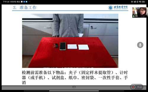 随后,刘晨老师重点介绍了如何进行新冠抗原自测,并进行了相关培训。新冠抗原自测是有自我检测需求的人员进行自我筛查的方式,其有着提高早发现的能力,起到前期筛查的作用,此外,抗原检测不能取代核酸检测,作为新冠病毒确诊的依据:阳性不诊断,阴性不排除。为了让同学们能更好的了解如何自测,刘晨老师亲手做了相关的示范,并对其中重要步骤做了多次提醒,之后老师连线多位同学进行交流,了解同学们的一些培训情况。