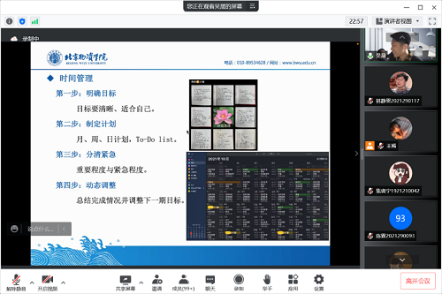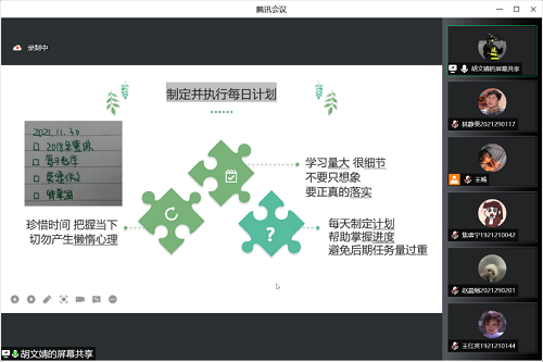 会议中,六位考研成功的同学从考研的整体规划、择校建议、学习方法、备考技巧和初试复试等方面进行了详细介绍,分享了他们的学习经验。吴晟同学主要从时间管理和精力管理两方面分享了经验,指出应合理安排时间,合理运用碎片时间,保持一个积极心态,找到适合自己的学习方式。王晓睿同学主要从择校、考研规划、英语学习经验三个方面进行介绍,分享了常用软件、时间安排、院校信息等。赵中华同学从目标、自制力、劳逸结合三个方面进行分享,指出要有较高的目标来激励自己,应尽可能地培养自己的自制力,规划好短期学习计划和复习计划等。