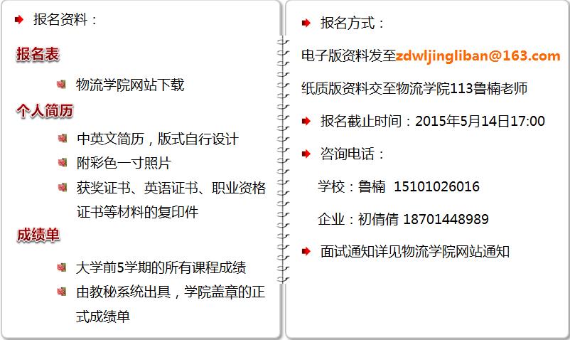 第四届“中都物流经理班”报名通知 来源: 发布时间:2015-05-13 浏览次数: 次 1. 需要提交的材料 2.申请人需要对所提交材料的真实性负责,如材料不真实学院将有权取消申请人资格,并要求申请人赔偿由此产生的相应费用。 3.所有材料提交的截止时间是5月14日下午17点。 报名表详见附件 附件【中都物流经理班报名表.doc】已下载次