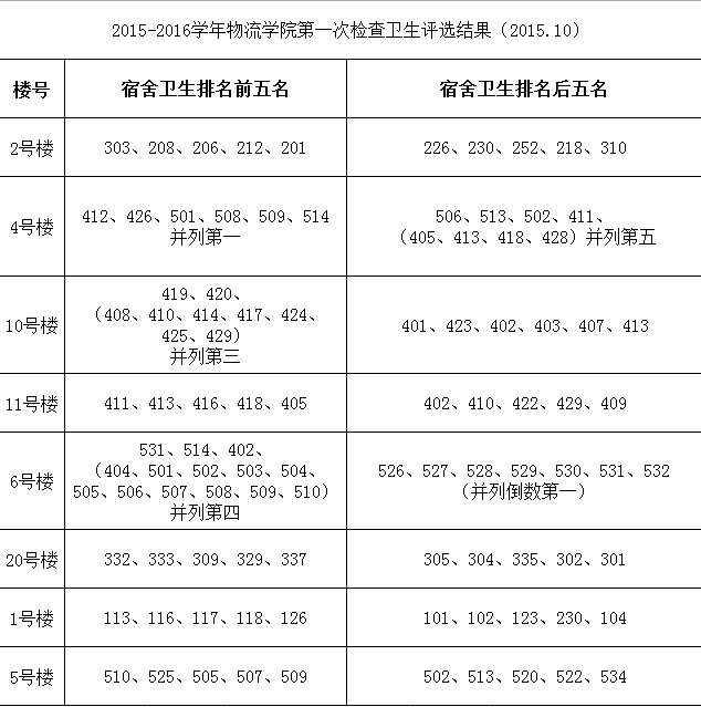 2015-2016学年绿帽小说 第一次检查卫生评选结果 来源:朱晓婷 发布时间:2015-10-22 浏览次数: 次 2015年10月21日下午4点,绿帽小说 学生会生活部对绿帽小说 全体宿舍进行了2015-2016学年第一次宿舍卫生检查。现将检查卫生结果公布如下: 希望各宿舍楼排名前五名的同学继续保持,排名后五名的同学不要气馁,认真打扫宿舍卫生,保持宿舍整洁,营造良好的生活环境。