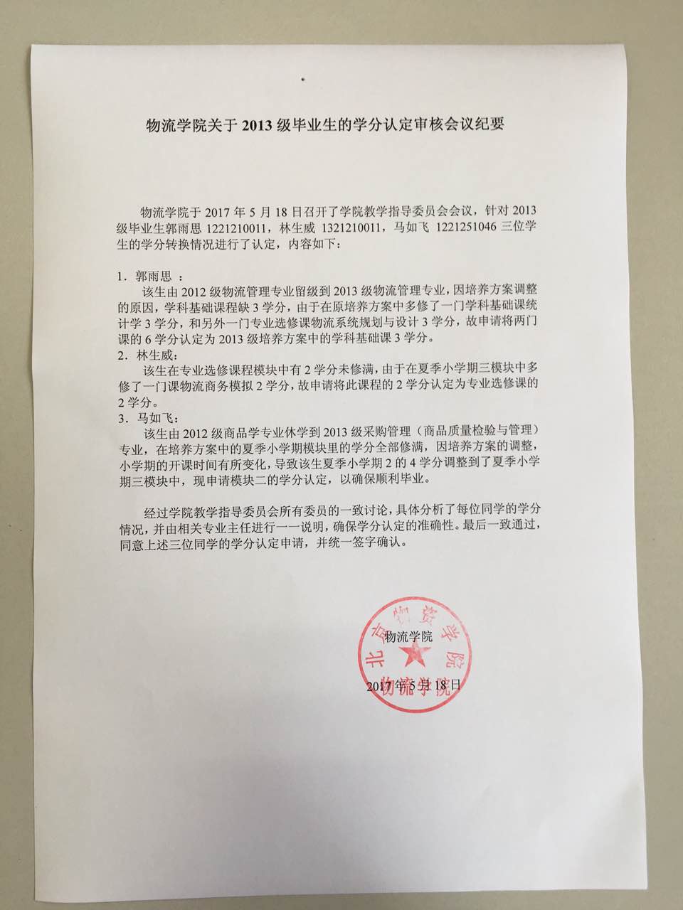关于2013级毕业生的学分认定审核会议纪要