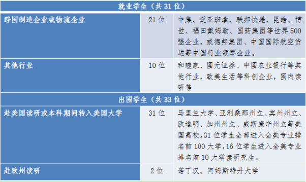 中美物流班学生们优秀的英语能力,为其在世界500强企业应聘中赢得明显竞争优势。国际课程体系和创新培养模式,让中美班物流班的学生们能学以致用,课程作业、实践小学期等批判性创新思维和自我学习能力的训练,让学生们在工作后换岗和团队的项目作业中具备较强的适应能力。学生们受到世界500强企业和中国领军行业企业的青睐,在应聘中赢得明显竞争优势,在就业中表现突出。
