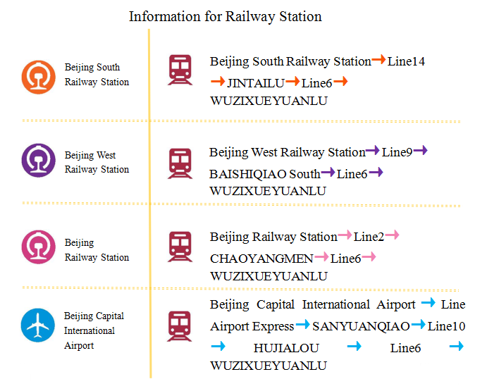 Subway: Line 2, Beijing Station -Jianguomen Station-Line 6, Wuzi University Road Station |