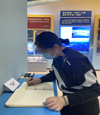 展览主题共分为十二个单元,当走到第十个单元坚持“一国两制”推进祖国统一展览馆时,同学们学习到了坚定不移贯彻“一国两制”方针,推动“一国两制”在港澳实践取得的巨大成果,同时意识到坚持贯彻“和平统一、一国两制”方针政策对推动两岸关系和平发展的重大意义。在第十展览主题陈列处,同学们留下了祖国两岸关系和平发展的美好祝愿,并纷纷在“两岸一家亲”留言簿中写下自己真挚的祝福!