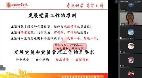 首先对发展党员工作原则进行讲解,要把政治标准放在首位,明确发展党员入党动机以及发展党员和党员管理工作的总要求,对发展党员进行综合考量,提高党员质量让党员充分发挥作用。党课着重介绍了发展党员的各项程序,同时各学生党支部书记老师强调了入党过程中的各时间节点,给出了入党发展的时间轴,使入党积极分子对发展党员程序有了更清晰地认识。
