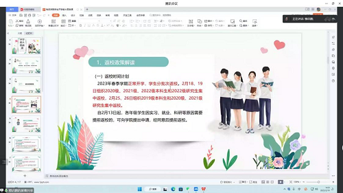 首先,穆启鹏老师详细介绍了学校发布的最新开学通知,即2023年春季学期正常开学,学生分批次返校。2月18、19日组织2020级、2021级、2022级本科生和2022级研究生集中返校,2月25、26日组织2019级本科生和2020级、2021级研究生集中返校。此外,学校还充分考虑到各年级因实习、就业、科研等原因需要提前返校的同学,自2月13日起可向学院提出返校申请,经同意后提前返校。