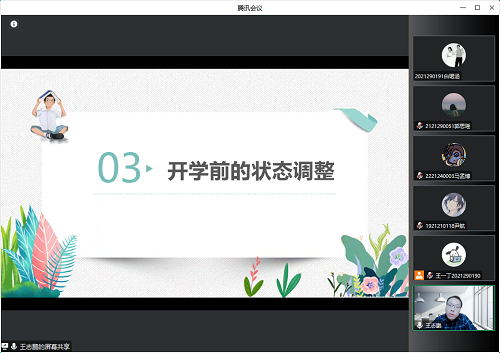 本次大思政课主要围绕返校政策解读、疫情影响下学生们所产生的心理问题调整方法以及开学前状态调整三个方面展开。首先对当下的返校政策和返校的注意事项进行了详细介绍,希望同学们在新学期伊始,能够严格遵守学校要求,分批次、安全、有序返校。并对同学们提出的返校相关问题进行了详细解答,强调大家要时刻做好自身防护,做自身健康的第一责任人。