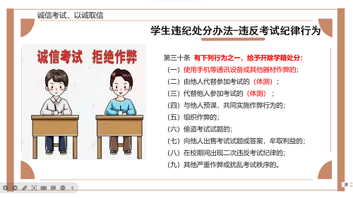 甄姿老师特别就诚信考试进行强调,列举了学生考试违纪处理办法:电子设备作弊、代替他人考试等行为要给予开除学籍的处分,组织作弊、抄袭他人试题答案等行为会给予留校察看的处分。孟子曰:“车无辕而不行,人无信则不立”诚信自古来都是中华民族的传统美德。诚信考试,是责任感的体现,诚信应考,是道德品格的体现。甄姿老师指出,希望同学们在考试过程中要端正学习与考试的态度,严格遵守考试规章制度,实事求是,杜绝一切考试作弊形式。