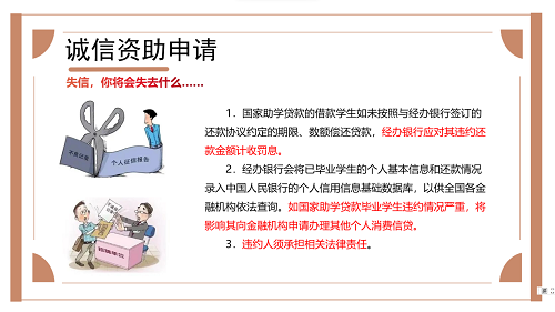 之后,甄姿老师为同学们深入讲解了什么是诚信资助申请,部分同学违反诚信申请资助的主要情形以及失信将会带来的后果。强调学生资助政策是使家庭经济困难学生能够顺利入学和完成学业的,“骗取助学金”不只有违道德,挤占名额耽误真正有经济困难的同学,更是触碰了法律红线。同时,申请征信资助后我们要按时还款,国家给予了我们圆梦考校的机会,我们必须牢记恩情。