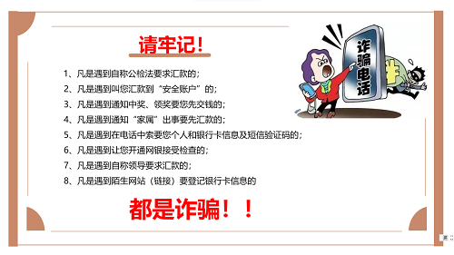 对于近期频发的网络诈骗案件,甄姿老师也进行了重点教育,着重强调了网络诈骗以及如何防范,列举了辅导员身边的事例提醒同学们:凡是遇到自称公检法要求汇款的,凡是遇到叫您汇款到“安全账户”的,凡是遇到通知中奖、领奖要您先交钱的都是诈骗行为。提醒同学不要随意泄露个人信息、不贪小便宜、不办看起来优惠的借贷,提高防范网络诈骗的意识,同时也不去诈骗别人。