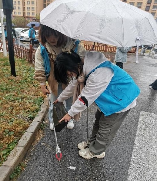 宣讲结束后,学员们以组为单位开展社区垃圾清洁活动。当天突降小雨,学员们仍积极投入到垃圾清扫的队伍中,有组织、有纪律地重点对社区内随手丢弃的烟头、路边卫生死角的白色垃圾、主干道的纸屑等环境问题进行清理。充分发扬了不怕苦、不怕累的志愿服务精神,在雨中成为了一道亮丽的风景线。以组为单位开展工作的安排也让同学们体验到了团结奋斗的重要性。