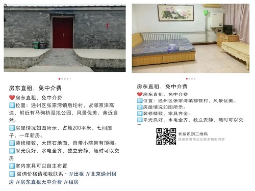 拓宽村民自建房宣传受众面——柳营村青壮年人口大多外出务工,村内自建房多数处于闲置状态,结合张家湾镇外来人口多、租赁住房需求旺盛的实际,党支部逐一入户考察,引导消防安全情况符合标准的村民整理空房,依法挂牌出租,同时为节省中介费用,党支部成员在小红书等社交平台上协助发布房屋租赁信息,发帖浏览数超1000人次,整体盘活柳营村自建房屋存量房源,让优质出租房源直达租客,实现供需有效对接。