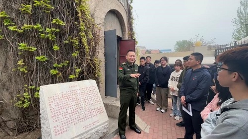 之后,学院师生参观了通县自来水塔遗址园,这座水塔,曾是伪冀东防共自治政府奉日寇之命建造的产物,它曾是日寇控制通州城的象征。为了加强统治,水塔填塞了全城的水井,并由特务严格控制供水,以此钳制百姓的生活。该塔至今保存完好,水塔上面由殷汝耕题词的“通县水塔”依然清晰可见,并在塔下树立起写有“勿忘国耻”的入党誓词展示牌,以此警示参观的民众与驻扎在此的官兵。