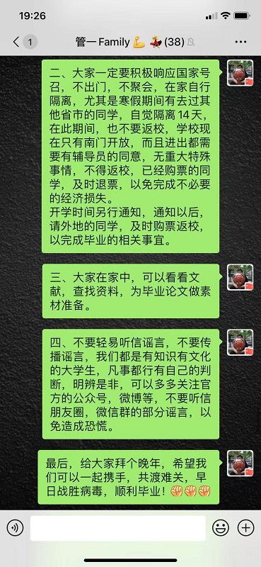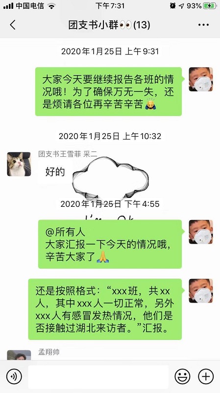 质量管理工程专业学生第二党支部的学生党员们在疫情防控期间,通过线上微信群进行交流,实时关注疫情发展情况,学习新型冠状病毒肺炎的相关知识,发挥先锋模范作用,将最前沿最科学的疫情防控信息传达到自己的亲友中。2019级研究生党员史浩然按时将班级同学的健康信息和防疫情况做出实时统计,保证学校在疫情防控期间对于学生信息的及时掌握。2019级研究生党员高天为武汉捐款50元及100个医用口罩,并在所在社区进行相关数据调研统计。2019级研究生党员张苗积极响应学校防控工作,自觉向家人朋友宣传正确的疫情防控知识。2017级本科生党员姜佳昕积极配合学校工作,对于疫情情况的发展能够及时传达到党支部成员当中,带领党支部成员共同应对疫情。面对疫情,质量管理工程专业学生第二党支部的学生党员们在行动。