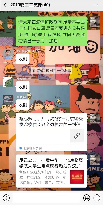 物流工程专业学生第一党支部的学生党员们在疫情防控期间,肩负起自身责任,心系疫情,用不同形式对新型冠状病毒感染的肺炎疫情进行防控。学生党员们积极响应号召,做好疫情防控工作,动员身边亲友通过朋友圈、微信、微博等社交网络转发官方主流媒体发布的信息,努力扩大防控知识覆盖面,做到不造谣、不信谣、不传谣,积极配合学校做好数据统计,带领同学和家人主动服从学校及当地要求和安排。2018级研究生党员王瑶每天早晚给家人讲解疫情情况,并在线联系亲戚朋友宣传疫情防控知识,劝阻家人取消春节聚餐,并叮嘱家里老人不出门不聚会,勤通风,勤洗手,注意消毒。2017级本科生党员邵薇通过腾讯公益捐款5元。2018级本科生党员张佳玥通过“众志成城共抗疫情”活动为武汉捐款100元。面对疫情,物流工程专业学生第一党支部的学生党员们在行动。