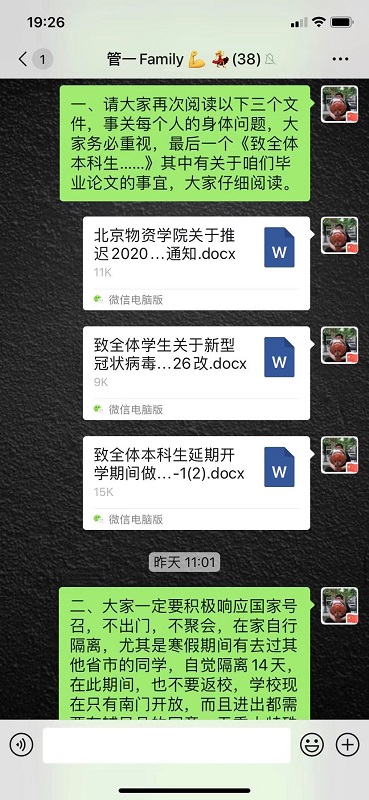 物流管理专业学生第一党支部的学生党员们在疫情防控期间,通过党支部微信群进行交流,对相关新闻进行转发,学习新型冠状病毒感染的相关科学知识,随时关注了解疫情现状及其所需,做力所能及的贡献,发挥先锋模范带头作用。不仅如此,学生党员们将学习到的知识讲解给身边亲友,动员大家一起防控疫情。2018级研究生党员卢殿博在村委会进行防疫志愿宣传和巡逻。2016级本科生党员严文涛积极配合学校做好数据统计工作,带领广大同学主动服从学校要求和安排,随时询问班级同学的身体状况以及出行信息,关心身边的每一位同学。2017级本科生党员张一雄通过腾讯公益,为武汉捐款60元。2018级本科生党员陈蕊为社区捐赠口罩3盒,为全力以赴打好疫情防控阻击战做出贡献。2018级本科生党员吴晟参与收集和整理同学们的信息,每天监督各班团支书汇报班级内实时防疫情况,积极配合学校工作。面对疫情,物流管理专业学生第一党支部的学生党员们在行动。