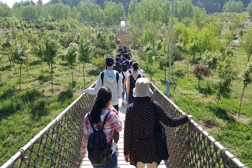 跟随向导的引领和一路讲解,同学们首先对整个农场园区的规模和经营规划有了大概的了解,步行千余米便来到了本次团建的第一个活动地点——“模拟红军长征路”。在这一项目中,老师和同学们要攀爬三段规格形式不同的绳索栈桥,每段栈桥都有对应的长征线路为主题,分别为:“瑞金开端”、“四渡赤水”和“激战腊子口”。在攀爬的过程中,老师和同学们往往需要手脚并用才能站稳在摇晃不定的绳索上,在通过一些跨度较大的踏板或低矮的通道时,还不时要测过身子一步一步的在绳索上腾挪或弓着腰深一步浅一步的艰难前行。