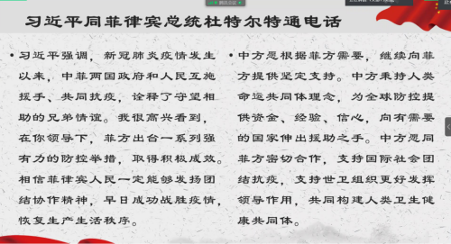 第二部分学习了习近平总书记与菲律宾总统杜特尔特的通话中展现的新冠肺炎疫情发生以来,中菲两国政府和人民互施援手、共同抗疫,诠释了守望相助的兄弟情谊。同时两方相信在抗疫和恢复发展的进程中,中菲传统友谊和互信将日久弥深,两国全面战略合作关系将迎来更广阔的发展前景。