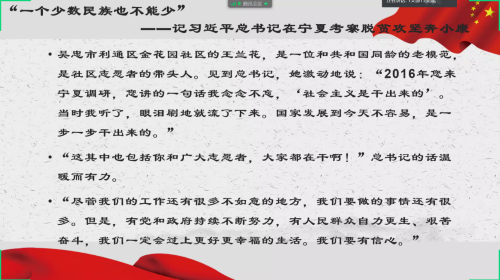 第三部分是学习了习近平总书记在宁夏考察脱贫攻坚奔小康,20多年,总书记四次考察宁夏,深入基层,为宁夏打赢脱贫攻坚战提供了强有力的后盾。总书记强调全部脱贫,并不是说就没有贫困了,就可以一劳永逸了,而是指脱贫攻坚的历史阶段完成了。相对贫困问题永远存在,我们帮扶困难群众的任务永无止境。脱贫攻坚路上,一个民族也不能少!
