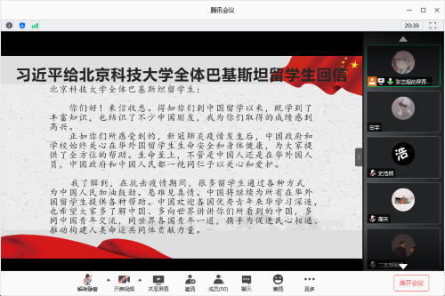 第一部分介绍了习近平总书记给北京科技大学全体巴基斯坦留学生回信并将信内具体内容做展示,解读了习近平总书记对疫情非常时期对国外在中留学生的关心爱护,和中国对外来学习中国文化的学生的欢迎以及共同建设人类命运共同体的美好向往。就像信中所写:中国欢迎各国优秀青年来华学习深造,也希望大家多了解中国、多向世界讲讲你们所看到的中国,多同中国青年交流,同世界各国青年一道,携手为促进民心相通、推动构建人类命运共同体贡献力量。