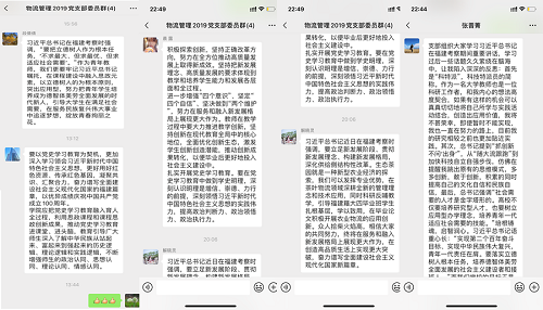 物流管理专业教工与学生第一、二、三党支部组织专业教工党员和学生党员通过自主学习,线上讨论的方式开展。活动期间,教师党员梳理了前期学习强国平台的学习资料,并结合此次活动的专题内容进行了认真细致的学习,通过微信平台分享了此次学习的心得体会。物流管理专业学生第一、二、三党支部组织学生党员进行线上集中分享,学生党员在学习后表示,“习近平总书记在福建考察的讲话精神,为我们深入学习贯彻习近平新时代中国特色社会主义思想提供了独特资源、生动教材。我们要带着特殊感情、特殊责任,持续深入学习采访实录,深刻感悟总书记的深邃思想、前瞻理念、民本情怀、务实作风,进一步提高学生党员政治站位,践行初心使命,提升素质本领,努力把学习成果转化为推动工作的思路举措。我们学生党员要牢记自己入党时的誓言,学习最新精神,发扬党员先锋模范作用。”