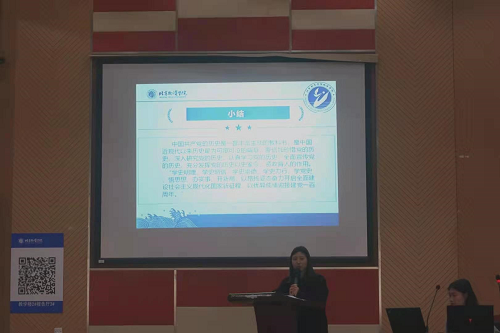 大会在悠扬的共青团团歌中拉开了帷幕,全体成员合唱团歌,铿锵激昂。接着,分团委书记李思奇老师从“为什么学习党史”、“怎么学习党史”两大方面讲述学习党史的重要意义并动员大家积极参与党史学习教育之中。关于“为什么学习党史”,李思奇老师从“三个必然要求”的方面,讲解“开展党史学习教育是牢记初心使命、推进中华民族伟大复兴历史伟业的必然要求;是坚定信仰信念、在新时代坚持和发展中国特色社会主义的必然要求;是推进党的自我革命、永葆党的生机活力的必然要求。”关于“怎么学习党史”,李思奇老师解读 “六个进一步”的根本内容,希望大家可以不断总结党的历史经验,不断提高应对风险挑战的能力水平,不断增强用党的创新理论武装自己的政治自觉。