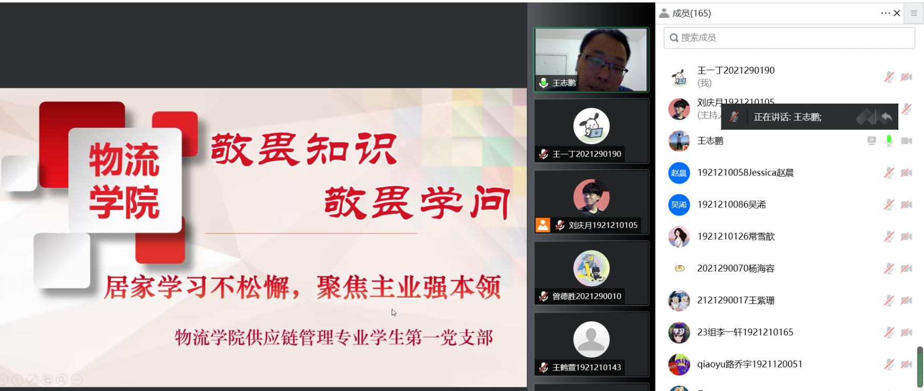 供应链管理专业学生第一党支部书记王志鹏,以“敬畏知识 敬畏学问”为主题,从居家学习面临的四个挑战及有效应对措施、警示案例回、做遵纪守法的大学生、防疫科普+抗原检测视频回顾、疫苗接种、每日打卡重要性强调、学生资助诚信教育活动及学生纪律管理规定、正向舆论积极心态自我提升、多手抓、稳向前,抗疫就业抓落实等几个方面为全体同学讲授了题为“敬畏知识 敬畏学问——居家学习不松懈,聚焦主业强本领”的“大思政课”。