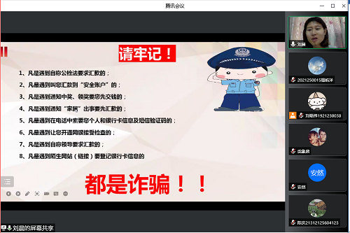 最后,刘晨老师向同学们讲述了疫情期间应聚焦学习主业、敬畏学业,强调了诚信教育的重要性,有如下几点:首先列举了学生违反诚信申请资助的主要情形有虚假申报、使用失信、拖欠还款。让同学们知道失信要承担相关法律责任;学校各项补助及评奖评优都涉及到诚信,在申报时,严禁弄虚作假、谎报情况;其次同学们要提高安全防范意识,谨防电信网络诈骗。冒充客服诈骗、冒充熟人诈骗、网购异常诈骗;此外,刘晨老师还强调了校园安全及户外旅行安全,防范火灾、谨防偷抢骗、将旅游与实践相结合,做好自我防护,提高应对突发事件的能力,自觉维护学校的形象和利益;最后老师对同学们普及了学习违反考试纪律行为类型及相应处分,警示同学们面对各项考试都应诚信考试,拒绝考试作弊。