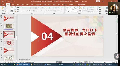 随后,李清月老师针对之前介绍的高校大学生违反疫情防控案例、疫情防控科普以及抗原检测方法进行回顾和强调,叮嘱同学们要以此为鉴,做遵纪守法的大学生。杜绝一切与防控要求相悖的事情,严守疫情防控工作纪律;正确使用抗原自测手段,为打赢防疫攻坚战做好技能提升和储备知识。