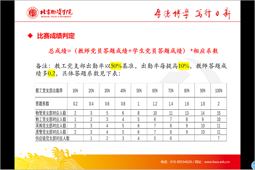 5个教工党支部和10个学生党支部均有党员参赛,每队10人,由教工党支部和学生党支部共同选派党员。参赛党员需在规定时间内登录“学习强国”平台进行双人赛与四人赛挑战,每人需要完成四次双人赛和两次四人赛,双人赛占总成绩60%,四人赛占总成绩40%。最终成绩由教师党员答题成绩与学生党员答题成绩共同组成,根据教工党支部出勤参与情况确认相应系数,总成绩为最终成绩与系数乘积。