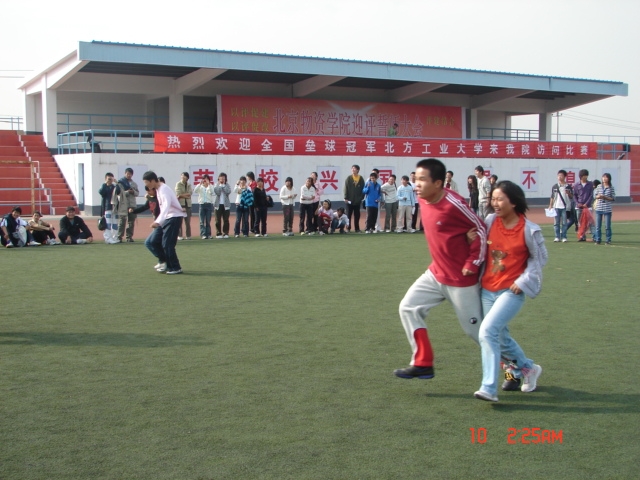 大一年级新生,以班为单位参赛,比赛分为三大项:跳长绳,两人三足和障碍足球。
