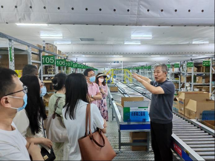 在李经理的全程引导和讲解下,青年教师们实地参观了公司的钢材货场、金属回收、医药物流、酒品仓储四大功能模块,全流程体验了入库、仓储、分拣、打包、复核等库内作业,真正实际触摸到物流的实践操作,现场体会到立体化自动分拣所带来的成本优化和效能提升,同时也认识到人工作业的必要性,包括系统控制室运行监控、自动拣选设备故障检修、小批量精细拣选等操作。在参观之余,青年教师们感受到物流作业的辛苦、物流人的智慧和物流体系持续优化完善的使命感。