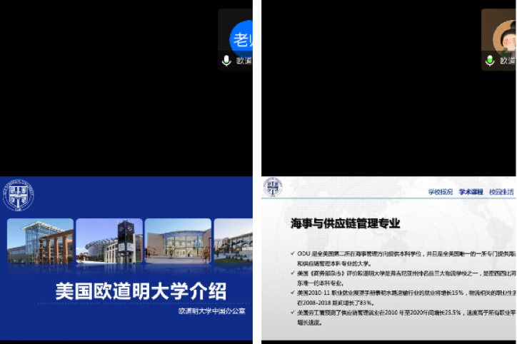 与欧道明大学的合作经历及师生交流状况。通过此次线上说明会,2019级中美联合培养供应链管理专业(国际物流与供应链管理方向)的同学们对欧道明大学有了更深的了解,明确了英语和专业课的入学要求。有意向申请欧道明大学研究生的同学也对该校物流相关研究生专业设置和入学要求有了一定了解,为今后深造和专业发展提前进行规划。