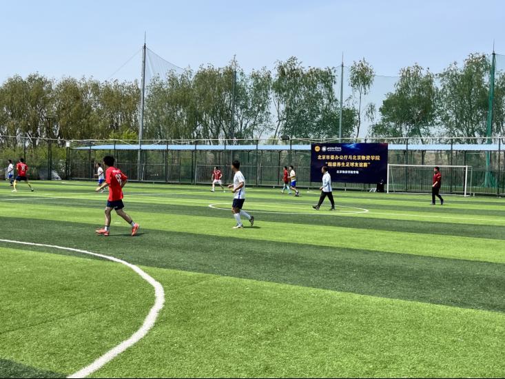 “超级养生足球协会”的运动健将们在学校西被侧足球场,与北京市委办公厅业余足球队进行了一场友谊赛。校工会常务副主席郝庆老师与校工会汤艳丽老师现场指导和观赛。友谊赛双方经过一个半小时的精彩角逐,比分定格在了4:4握手言和。