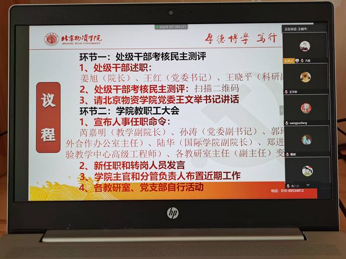 处级领导干部考核工作方案》及《关于2019年度处级领导干部考核工作补充说明》的文件精神,对测评工作进行简要说明,学院3位处级领导从工作履职、理论学习、廉洁自律、改进方向等方面,依次述职述德述学述廉。述职结束后,全体同志通过线上扫描二维码进行民主测评。整场述职过程既是对处级干部个人的工作总结,也是对2019年学院整体工作的全景回顾,在处级干部身上体现的种种成绩,凝结的是全院教职员工的辛勤付出,凸显的个别问题也是全院需要整改修正的目标和方向。