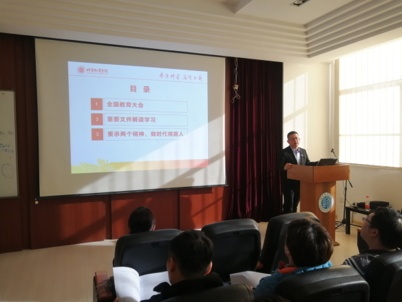 最后,会议安排姜旭院长为全体教职工讲授“不忘初心、牢记使命”主题教育专题党课,党课生动回答了教育为谁办、怎么办的问题,对全国教育大会、重要文件解读进行了体会分享,重点强调了全体教师要秉承两个精神、做时代领路人的时代格言。