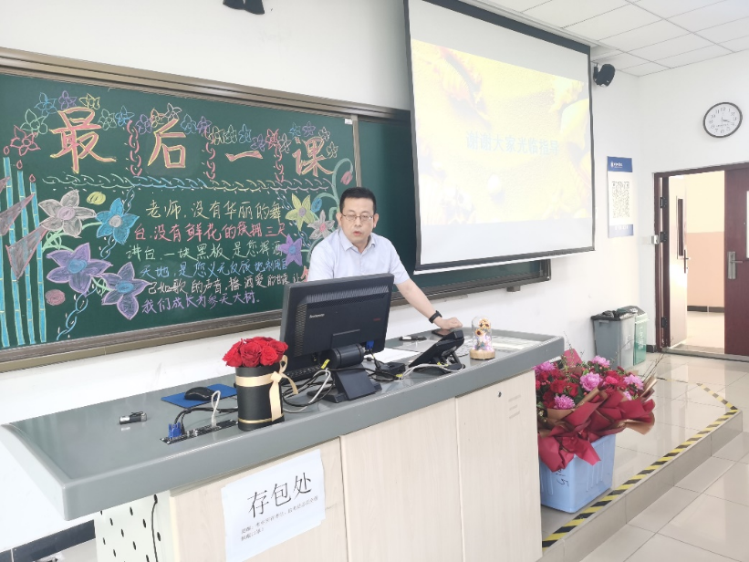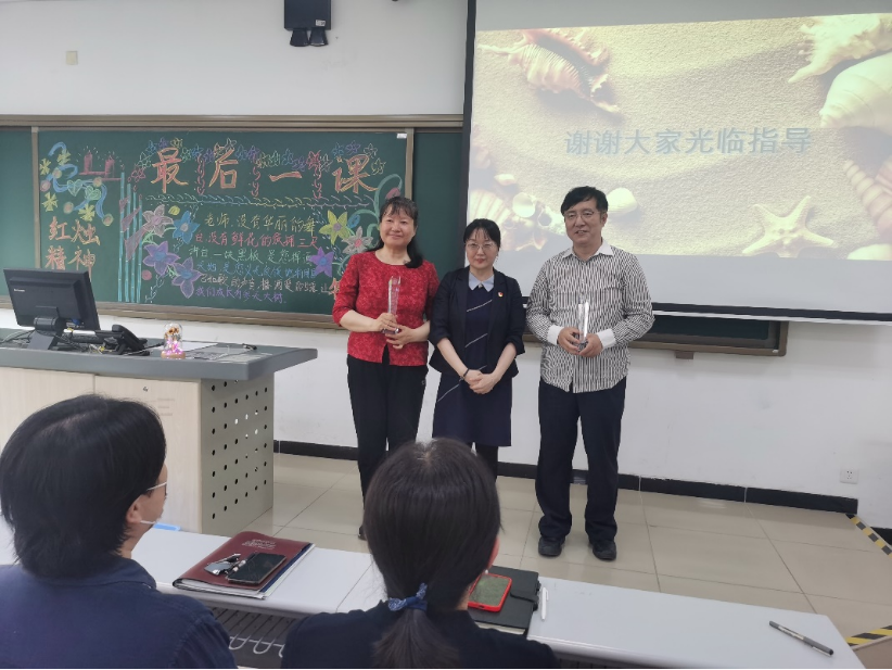 学校机关党委书记、校工会负责人郝庆老师代表校工会对两位即将退休的老师送上祝福,并宣读了校工会写给两位老师的信。学校教师发展中心主任孙静老师说,课堂是教师的道场,既是布道场,又是施道场,体现着一个教师最大的价值和最高的尊严,最后以“夕阳无限好、晚霞别样红”送给两位老师。