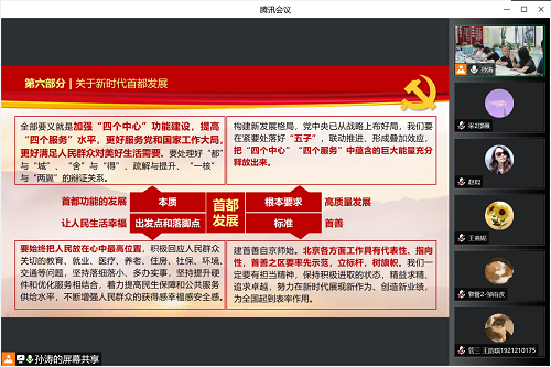张侃处长指出,报告总结成绩部分从党的十八大说起,一体审视新时代大背景下,首都北京取得的“四个转向”,使得与会人员在知悉首都北京取得的光辉成绩的同时明确了城市转向定位。党的十八大以来,习近平总书记10次视察北京、18次对北京发表重要讲话,深刻回答了“建设一个什么样的首都、怎样建设首都”这一重大时代课题,为做好新时代首都工作指明了方向。报告总结过去五年,首都北京发生了新的历史性变化,科学分析了新征程上首都工作面临的新形势、新挑战,明确了北京要在向第二个百年奋斗目标进军新征程中一马当先、走在前列,力争率先基本实现社会主义现代化,建设好伟大社会主义祖国的首都、迈向中华民族伟大复兴的大国首都、国际一流的和谐宜居之都,擘画了新时代首都发展的宏伟蓝图。