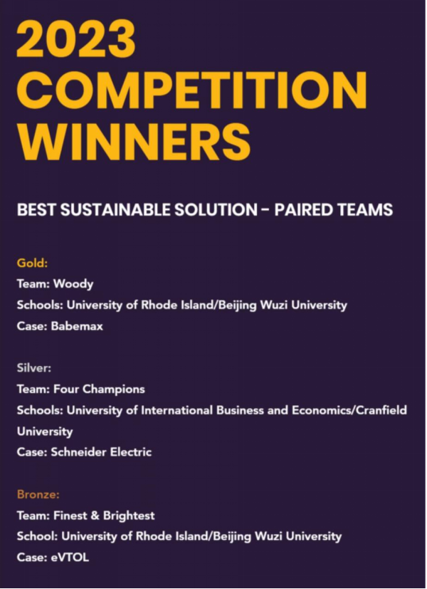 The competition simulates real-world business operations, brings together student teams from developed and developing countries to collaborate and develop action oriented sustainable solutions for global supply chain challenges. 71 participating teams from around the world are developing and producing innovative solutions for the challenges faced by sustainable supply chain development. This includes Tsinghua University in China, University of International Business and Economics, Beijing Wuzi University, University of Maryland in the United States, University of Rhode Island in the United States, Iowa State University in the United States, French Institute of Advanced Logistics, Frankfurt University of Technology in Germany, University of Algeria, Tajikistan University of Technology, etc.After the first round of regional competition (written submission in English) on October 22, 2023, the second round of regional competition (English speech presentation) from November 11 to 19, 2023, and the third round of global competition (English speech presentation) on December 4, 2023, 8 teams stood out. Among them, two groups composed of four students from the Logistics School of our university and four students from the University of Rhode Island in the United States won gold and bronze medals respectively: