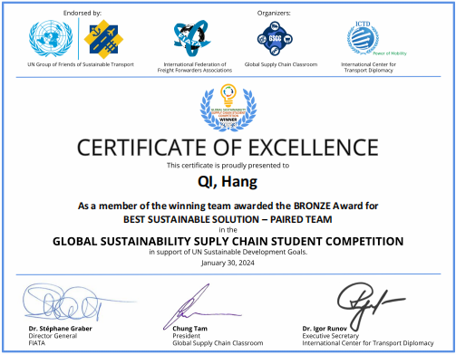 供应链管理专业(国际物流与供应链管理方向)的孙子乔同学,受邀参加在瑞士日内瓦国际会议中心举办的2023全球可持续供应链学生竞赛(2023 Global Sustainability Supply Chain Student Competition)颁奖典礼,并领取全球可持续供应链学生竞赛铜牌,这是我校学生首次获得全球国际竞赛奖项,创造了历史!2024年,正值物流教育30年,意义非凡!