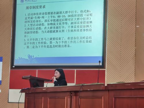 接着,分团委副书记孟笑靥向在座各位讲解分团委学生会规章制度要求,办公室主任张一进行团委学生会办公室使用培训,介绍了会议室、办公室、仓库及功能区的位置及使用注意事项。