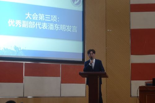 大会第三项,优秀副部代表潘东明发言,向我们讲述了他这一年来在分团委学生会的点滴体会。作为一名物院青年,应发扬物院传统美德,牢记校训“厚德博学,笃行日新”,作为分团委学生会的一员,更要始终保持一颗责任心,认真负责地完成学院分配的各项任务,为学院建设添砖加瓦。